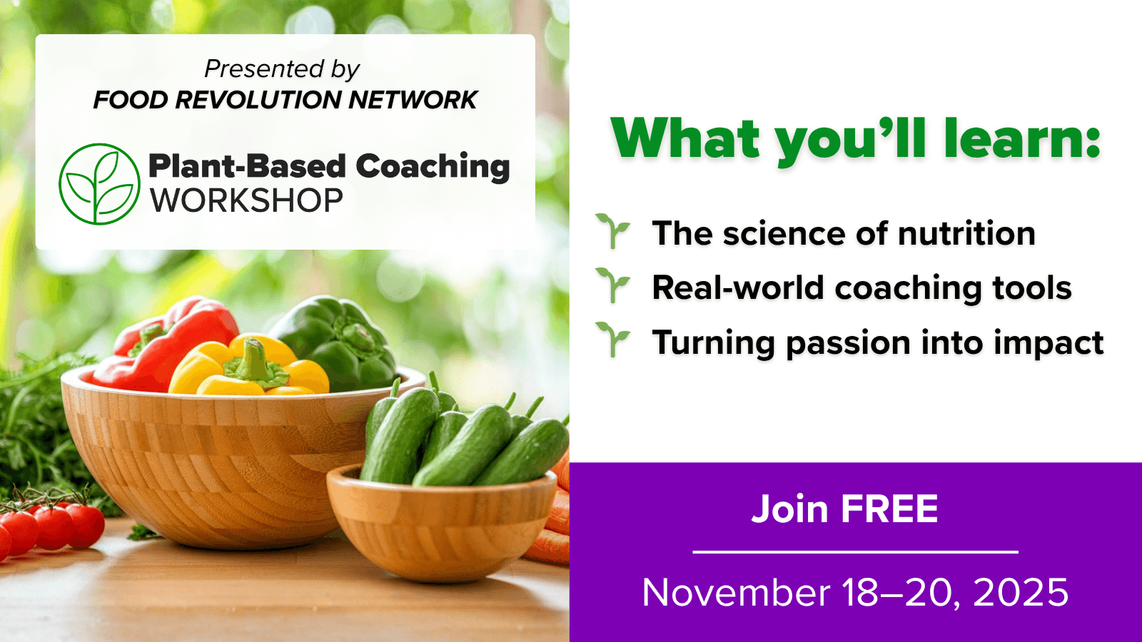 That’s why we’re excited to share an opportunity from our friend Ocean Robbins and the Food Revolution Network: the Plant-Based Coaching Workshop: Nutrition, Healing, and Coaching in the Modern World.